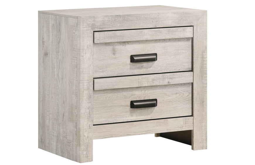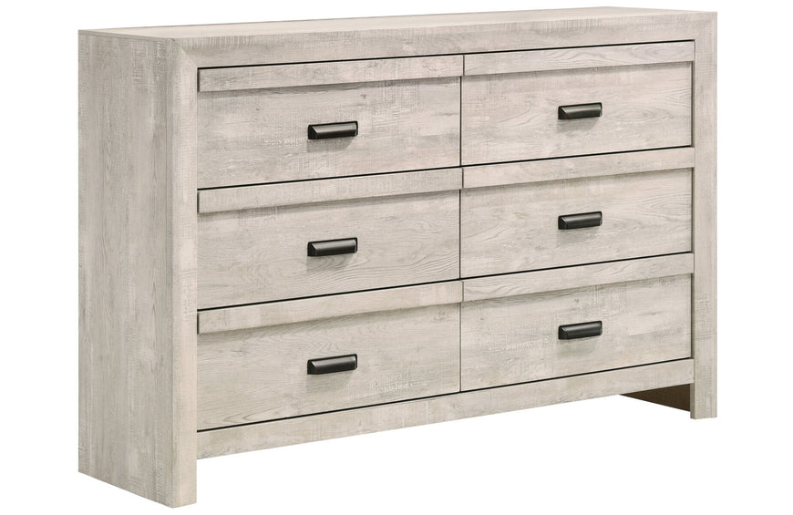 You’ll dream in style in the casual contemporary Petunia Panel bedroom set. A vibrant beige finish with clean lines adds to this stylish set along with a paneled headboard. Each piece in the set is made from hardwood veneers and solids yielding a durable construction. The case pieces have black/brown metal hand pull hardware which contrasts the beige finish perfectly. The dresser has six drawers and is paired with a rectangular landscape mirror. The nightstand has two drawers for additional bedside storage space.
