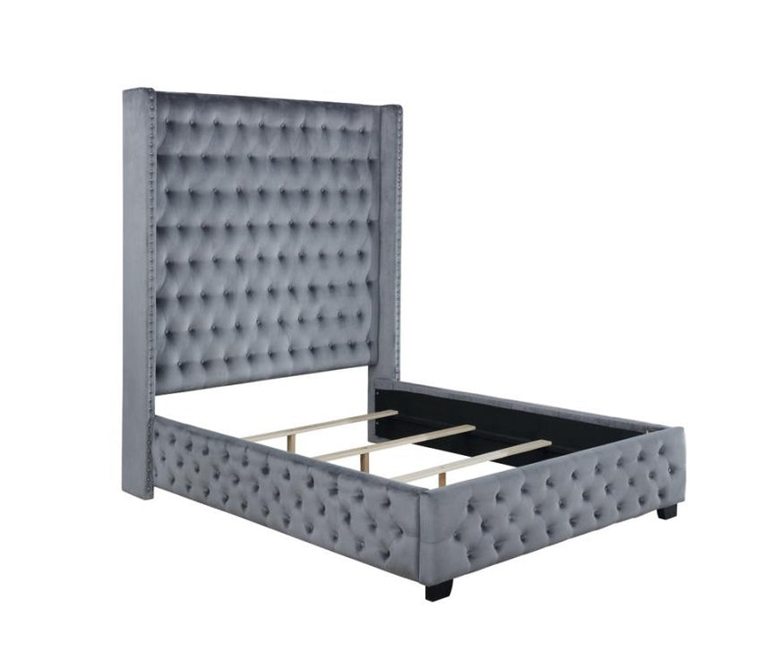 Create a stylish addition to your bedroom that's larger than life with this velvet upholstered bed. entirely wrapped in luxurious velvet, this panel bed is delightfully comfortable and glamorous. the headboard is constructed with vertical tufting that makes a modern impression in your sleeping space. this bed is supported on sturdy tapered legs that further enhances its appearance. crafted with durable and long-lasting pine wood.