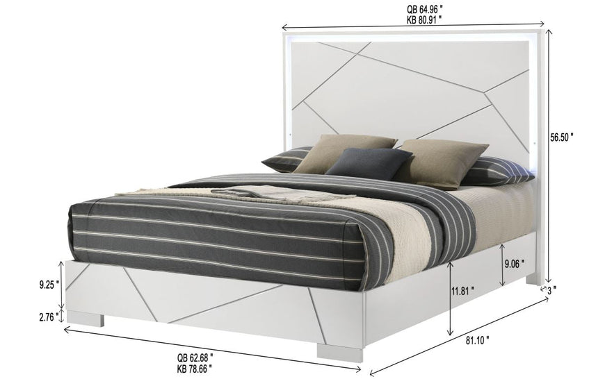 Transform your bedroom into a contemporary sanctuary with this sophisticated and stylish furniture ensemble. Defined by its bold geometric accents and pristine high-gloss finish, this collection exudes modern elegance while maintaining a clean, minimalist aesthetic. The centerpiece bed is enhanced with a dramatic LED-lit headboard, adding ambiance and a touch of luxury to your space.