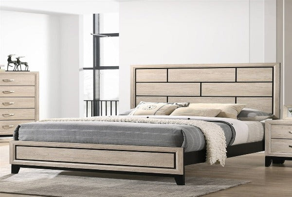 You will surely be impressed by this Driftwood King Bed. It features a panel headboard, a low-profile footboard, and tapered wooden legs. Finished in a neutral, blonde tone, this set will easily fit into any home decor.