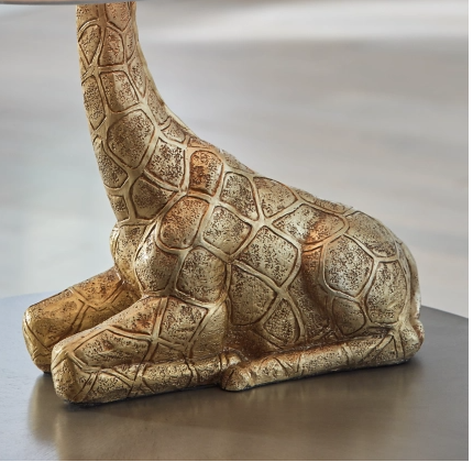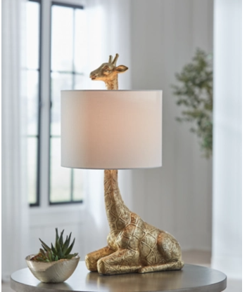This giraffe lamp combines contemporary style with eclectic charm. The curious animal peeks out over the top of the shade, adding a playful touch to the safari-inspired vibe. For glam appeal, a goldtone finish completes the look. Made of polyresin with drum hardback fabric shade Goldtone finish On-off switch 1...