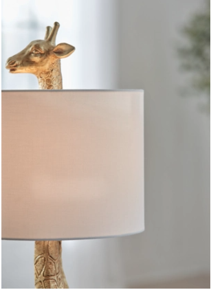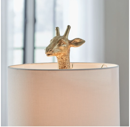 This giraffe lamp combines contemporary style with eclectic charm. The curious animal peeks out over the top of the shade, adding a playful touch to the safari-inspired vibe. For glam appeal, a goldtone finish completes the look.