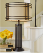 Add a touch of rustic industrial style to your decor with this eye-catching table lamp. Its drum shade and decorative metal frame bring an appealing touch to your home. A dark brown finish complements the shade's lighter neutral color, making this lamp ideal for enhancing casual urban living space decor....