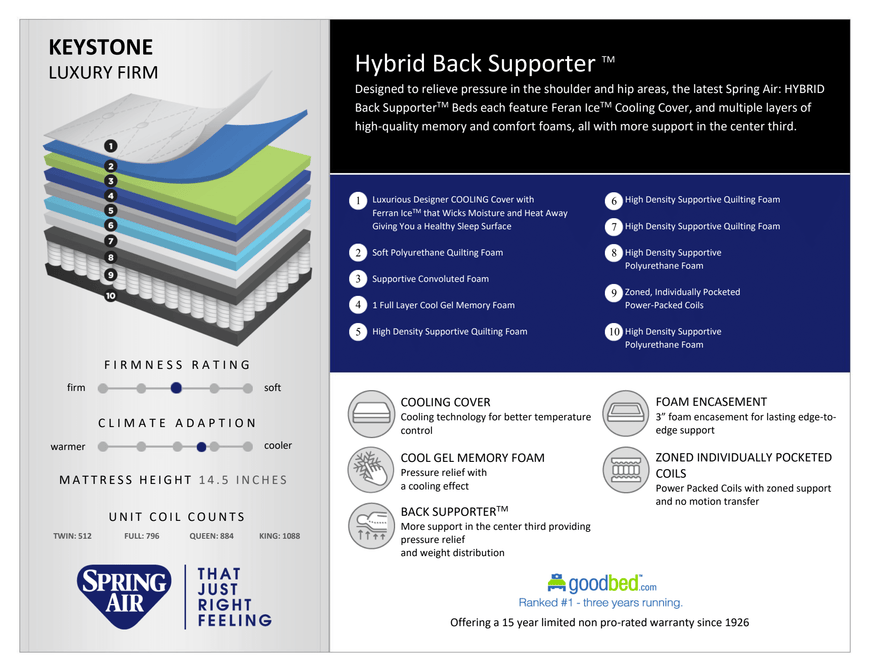 The Spring Air Keystone Luxury Firm Back Supporter is designed to relieve pressure in the shoulder and hip areas. Th center-support design begins with a patent-pending carbon-neutral eco-friendly base. With the multiple layers of high-quality memory and comfort foams which delivers longer-lasting back support along with the Feran Ice Cooling Cover.