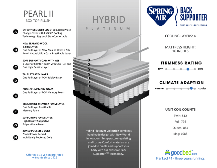 The Pearl II Box Top Plush is a hybrid mattress that combines the best individual coil unit with Talalay Latex, New Zealand wool and silk for breathable comfort and a generous layer of cooling memory foam giving that comfortable, cozy feel you love in a mattress. EnFinit® DESIGNER COVER Luxurious Phase Change Cover with EnFinit® Cooling Technology. The naturally healthy latex layer adds longevity, support, and coolness to the mattress. Cool gel technology is infused in the memory foam helping to reduce motion transfer and delivering reliable pressure relief where it's needed most. Get the night's sleep you deserve with the Pearl II Box Top Plush Mattress.
