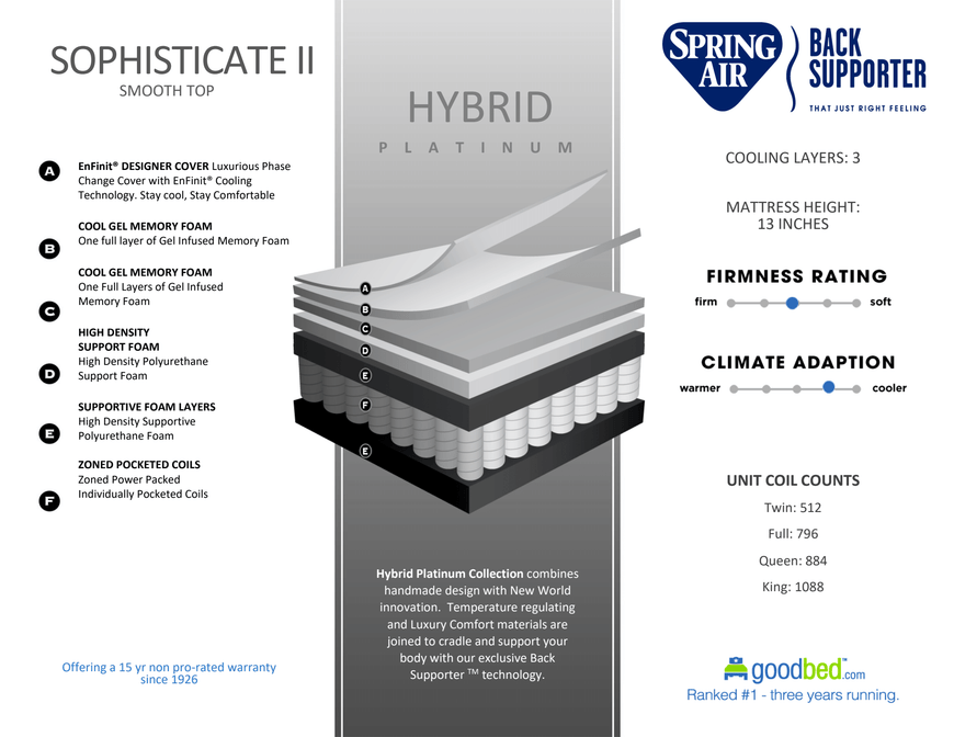 The Sophisticate II Smooth Top is a hybrid mattress that combines the best individual coil unit with EnFinit® DESIGNER COVER Luxurious Phase Change Cover with EnFinit® Cooling Technology. Cool gel technology is infused in the memory foam providing pressure relief where it's needed most. The Sophisticate does not sacrifice support for comfort...