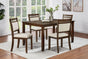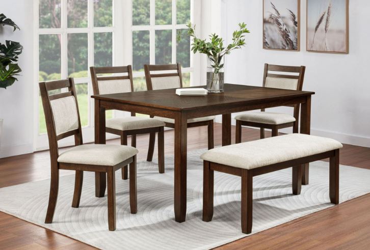 Timeless and refined, this dining group features a rich wood finish and clean-lined silhouettes that bring a sense of warmth and tradition to the dining area. The tabletop showcases an eye-catching veneer pattern that adds visual depth, while the tapered legs offer a classic touch. Each chair combines a gently curved backrest with an upholstered seat and inset panel for enhanced comfort and support. The separately available bench offers even more seating options. Designed to accommodate both everyday meals and special gatherings, this set blends durability with understated elegance for a look that endures.