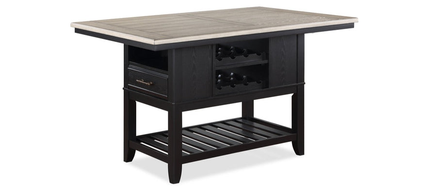 This counter-height dining table is designed to be both functional and stylish. The table features a built-in wine bottle storage area, perfect for keeping your favorite bottles of wine within easy reach while entertaining. The table also has an open bottom shelf that provides additional storage space for your dining essentials. Additionally, the table has a convenient drawer that can be used to store napkins, silverware, or other small items. The top of the table is perfect for serving meals, while the open shelf is ideal for displaying your favorite decor items. The sleek design and ample storage options make this table a great choice for any kitchen or dining area.