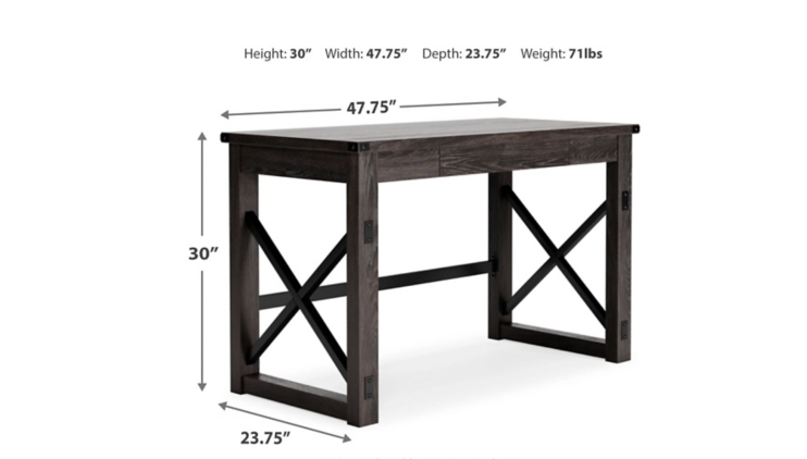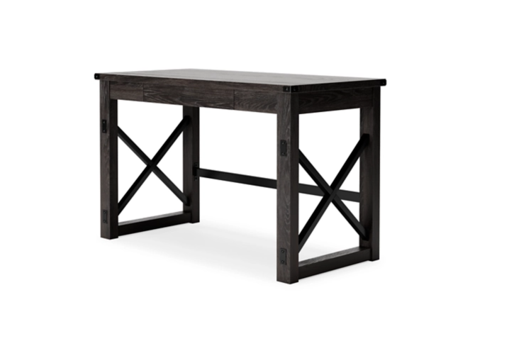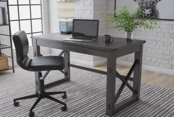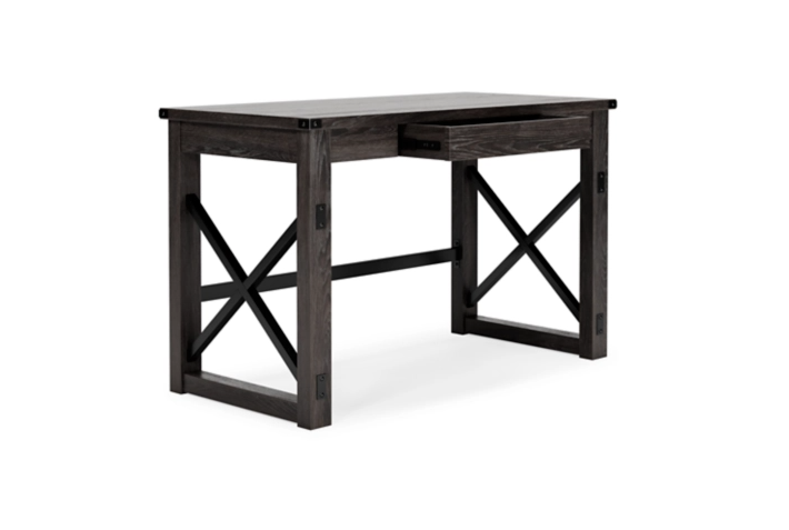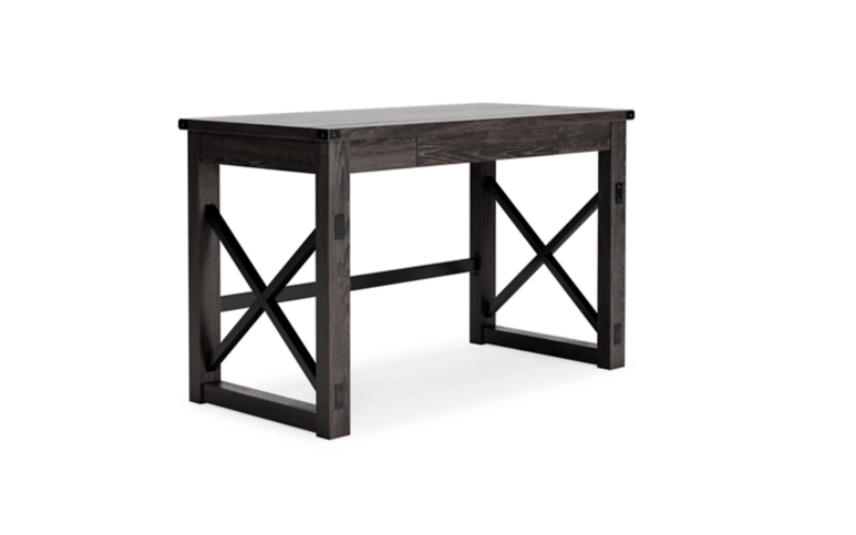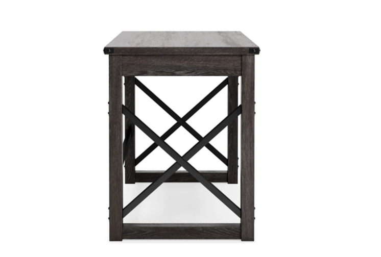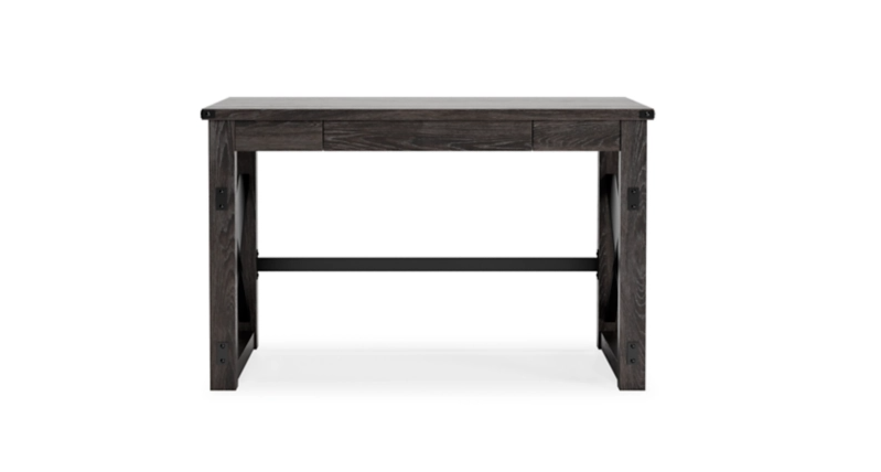 Love an urban farmhouse aesthetic? Make it work to your advantage with this beautifully styled desk. This simply striking choice in home office furniture has an unmistakable farmhouse feel thanks to design elements including a gray decorative wood grain laminate contrasted with crossbuck rails, metal accents and a stretcher in black. Perfect for office supplies, the desk includes a handy center drawer with hardware-less aesthetic to help keep your desk top clutter free