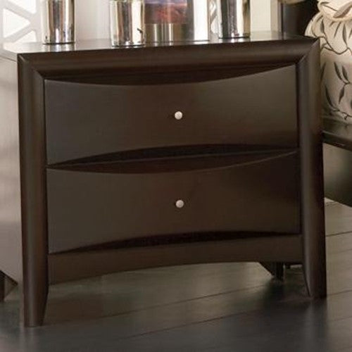 This elegant contemporary bed will be a stylish and functional addition to your master bedroom. The piece features clean lines, and spacious storage. A high bookcase headboard has two small felt lined drawers to hide clutter and precious items, and two open shelves that are perfect for books and decorative items. Two drawers below each side of the bed, and four drawers in the footboard offer lots of spacious storage for clothing and linens. Chambered drawer fronts and simple metal hardware complete this modern look. This bed is really a bedroom set in a bed, available in deep Cappuccino finish to complement your decor.