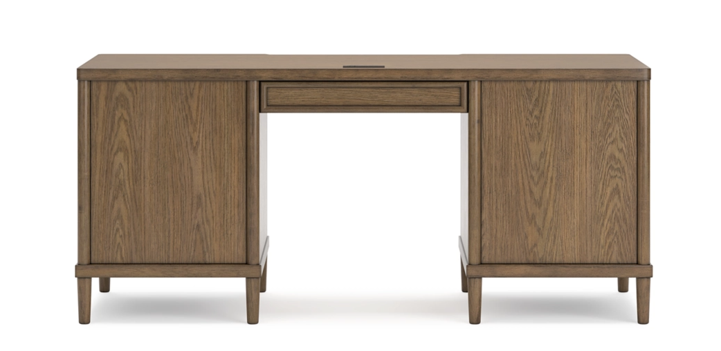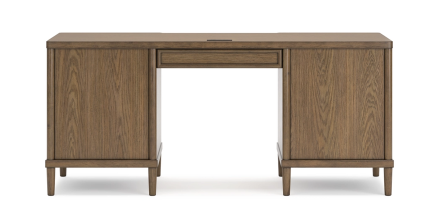Give your mid-century modern decor that finishing touch with this home office desk. Spacious drawers with unique wooden drawer pulls enhance the design with stunning style. This desk takes minimalism to the max. Made with hardwood solids, oak veneer and MDF substrate Brown oak finish Wood and metal drawer pulls...