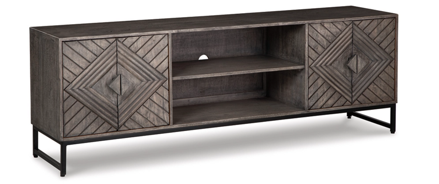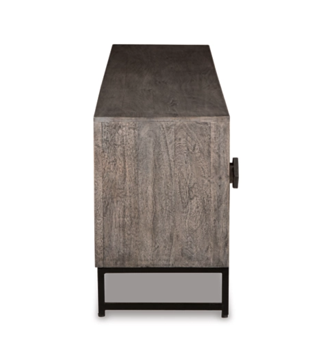 For admirers of understated vintage glamour, this accent cabinet beautifully complements your desired aesthetic. The classic charm of a distressed gray finish meets chic metropolitan styling, with art deco-inspired door fronts and an industrial black metal base. A balanced blend of contemporary and casual design, this piece is the personification of laid-back luxury.