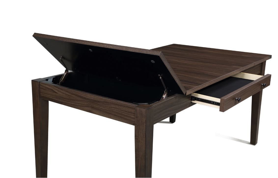 Redefine your dining experience with this sophisticated and multifunctional dining set, designed to blend elegance with practicality. The table boasts a sleek, contemporary design with a rich wood finish that adds warmth and character to any space. Dual ended hidden storage compartments and two built-in side drawers are thoughtful features, ideal for keeping essentials like utensils or napkins within easy reach. This dining set combines modern functionality with timeless charm to enhance any home. This set includes a table and 4 chairs. (BENCH SOLD SEPARATELY)