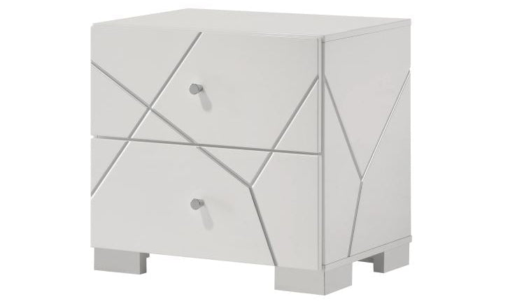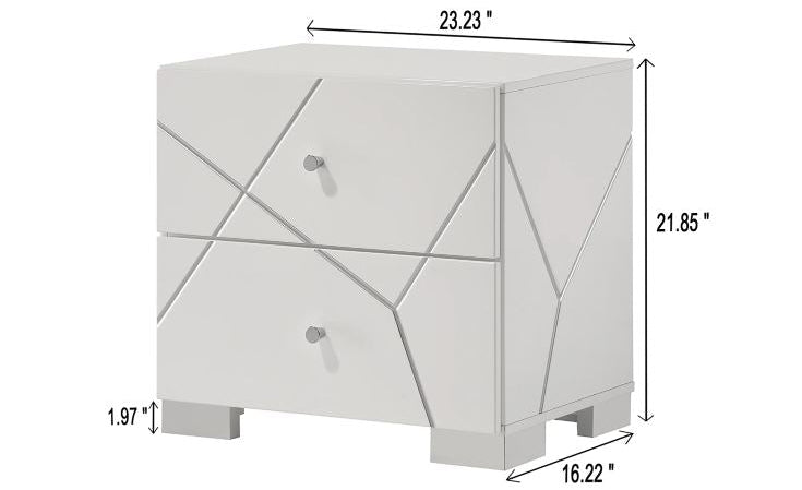 Transform your bedroom into a contemporary sanctuary with this sophisticated and stylish furniture ensemble. Defined by its bold geometric accents and pristine high-gloss white finish, this collection exudes modern elegance while maintaining a clean, minimalist aesthetic.
