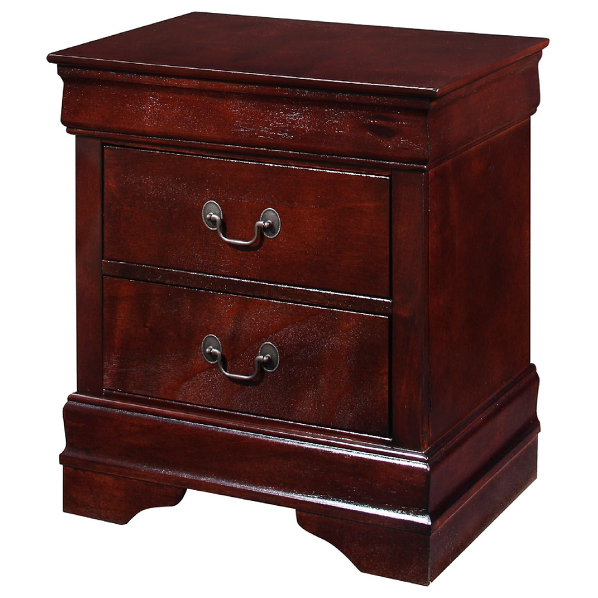 The Philip Cherry Nightstand is an enchanting addition to your sleeping space. Made with select hardwoods and a cherry finish, this piece is warm and matches well with any décor. This piece has beautiful features such as simple molding at the top, metal bail handles and bracket feet