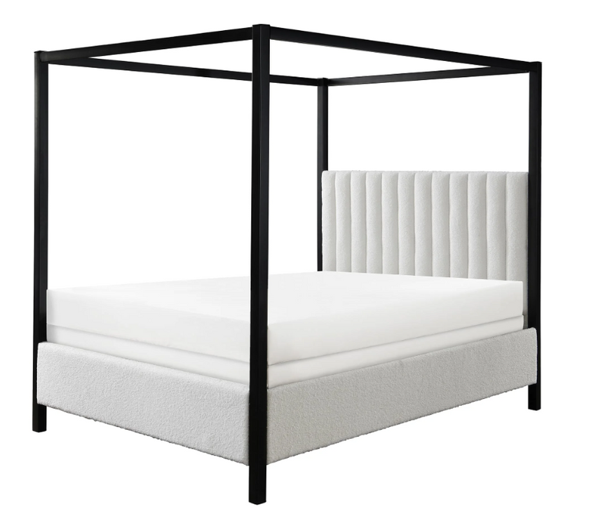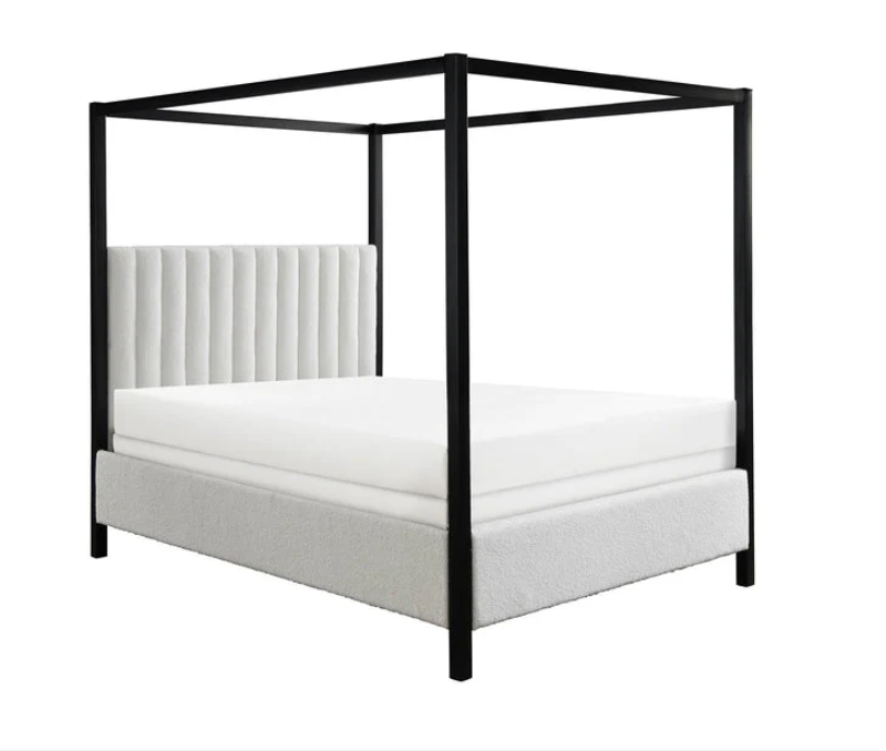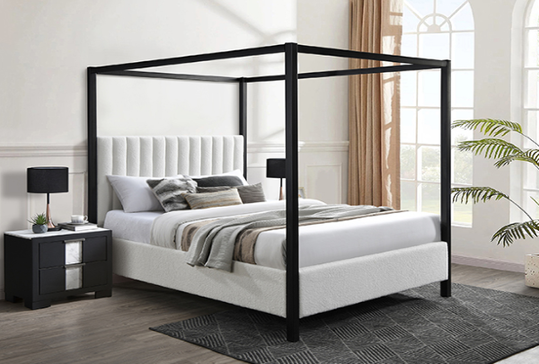 This canopy bed is a modern statement piece, blending the luxurious feel of a traditional four-poster bed with the clean, sleek lines of contemporary design. Its bold, black frame creates a striking silhouette against any bedroom backdrop, while the plush, tufted headboard in a cozy boucle upholstery adds a touch of elegance and comfort. The bed's commanding presence is softened by the fabric's texture, inviting a serene and restful sleep.