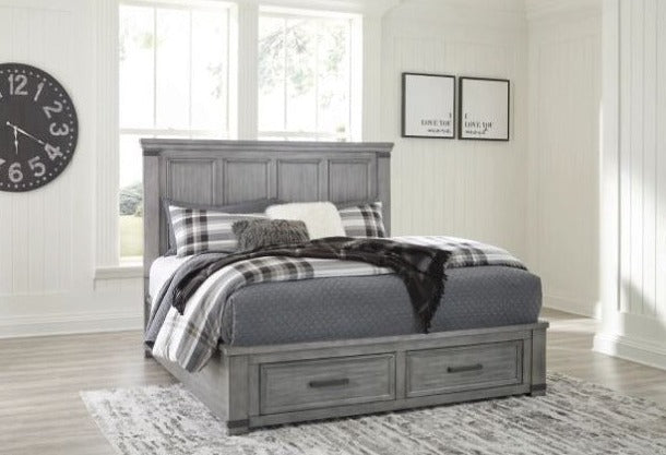 With its light weathered gray coloration, this storage bed conveys trend-right urban farmhouse style. Thick-profiled top moulding on the tall, mansion-scale headboard lends a fresh take on a timeless design. The footboard features two storage drawers with profiled frames and dovetail construction. Bar pulls and metal straps in a dark...