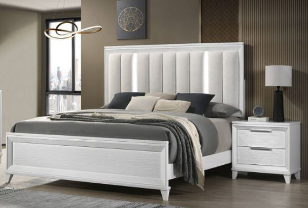 The Cressida will surely make a statement in your bedroom. It features tapered front feet, a low footboard, an upholstered cushion with LED lights on the headboard, and comes in a white finish.  Dimensions  Queen Bed: 63×89.5×64
