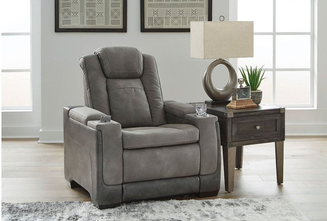 This sleek, ultra-modern power recliner has it all. With designer looks and head-to-toe comfort, it has the upscale look of leather at a scaled-down faux leather price. Its gray two-tone upholstery is more durable and water-repellent than regular leather, an added bonus for families with children or pets. Features including wireless and USB charging, an adjustable headrest and an extended "zero-gravity" ottoman for improved circulation make this the next generation of power recliners.