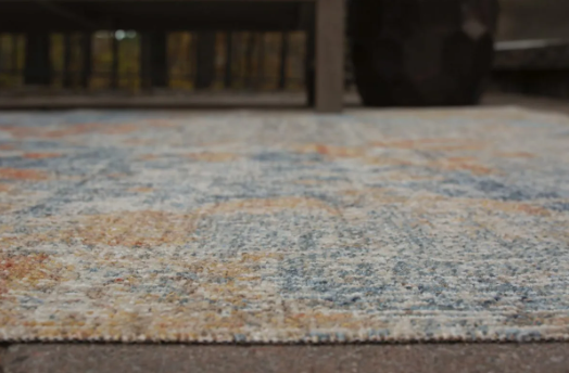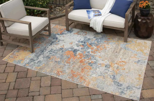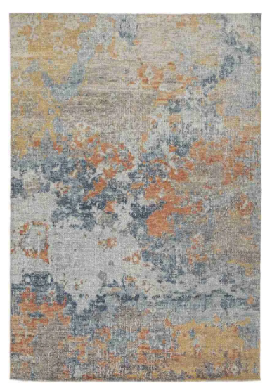 With its striking abstract pattern, this indoor/outdoor area rug leaves so much to the imagination. Its ethereal design—in shades of blue and hues of ivory, taupe, mustard and burnt orange—dresses up a room with brilliant color, visual texture and a highly contemporary point of view.