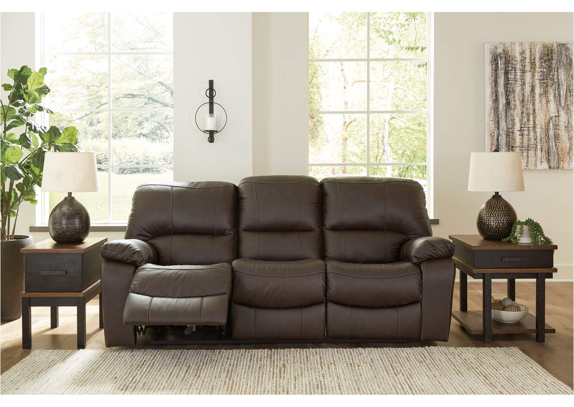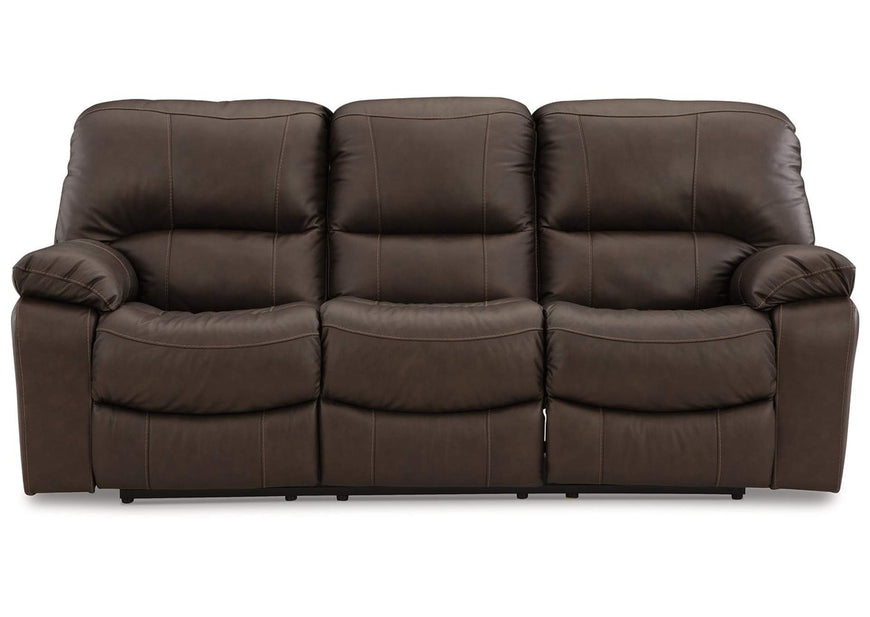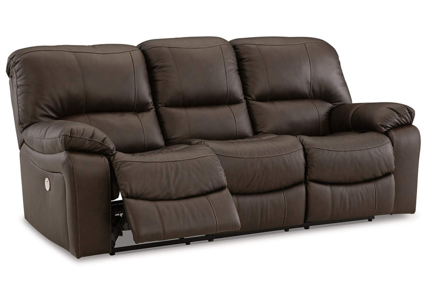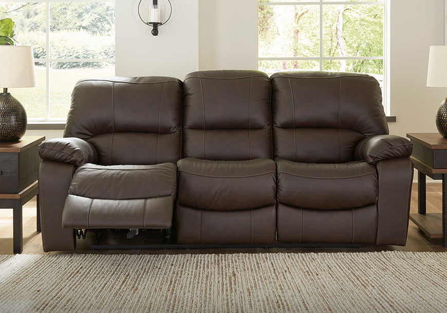 This practical power reclining sofa emphasizes functionality, combining contemporary character with irresistible comfort. Its affordable, leather upholstery ensures a stylish look without breaking the bank. With the convenience of reclining at the touch of a button, this piece is perfect for relaxed, luxurious seating areas designed for quality time.