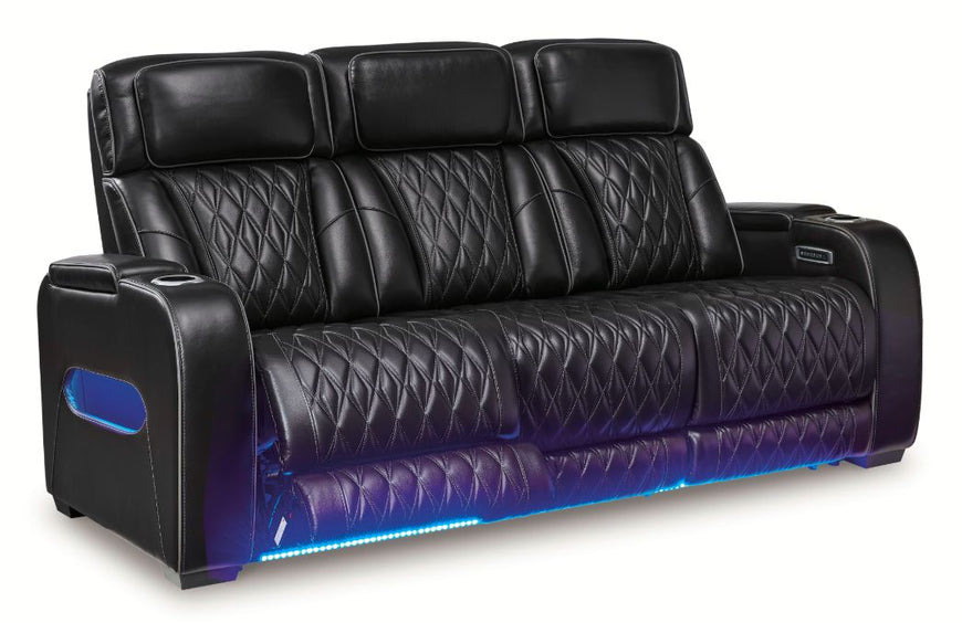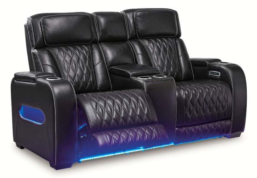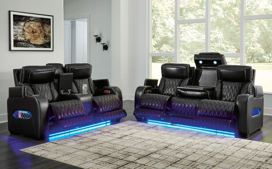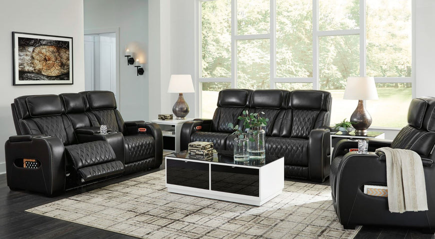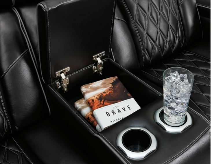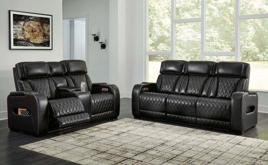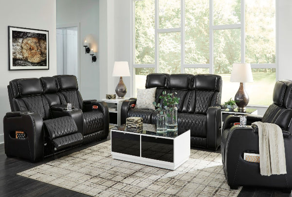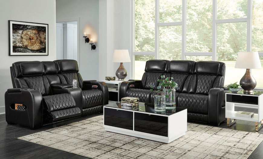 Transform your living space into a hub of comfort and style with the Boyington Power Sofa & Power Console Loveseat in Black. This luxurious set features leather match upholstery and a durable metal frame for long-lasting quality. Both pieces offer dual power reclining mechanisms, allowing you to adjust the headrests and footrests effortlessly at the touch of a button. The loveseat includes a convenient center console with storage and four cupholders, while the sofa also boasts four cupholders and hidden storage.