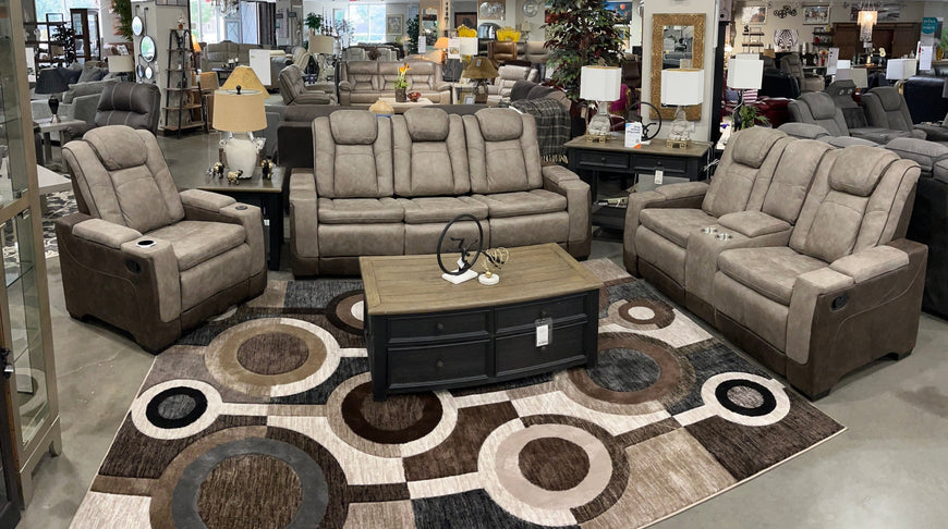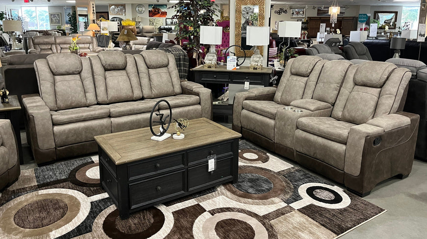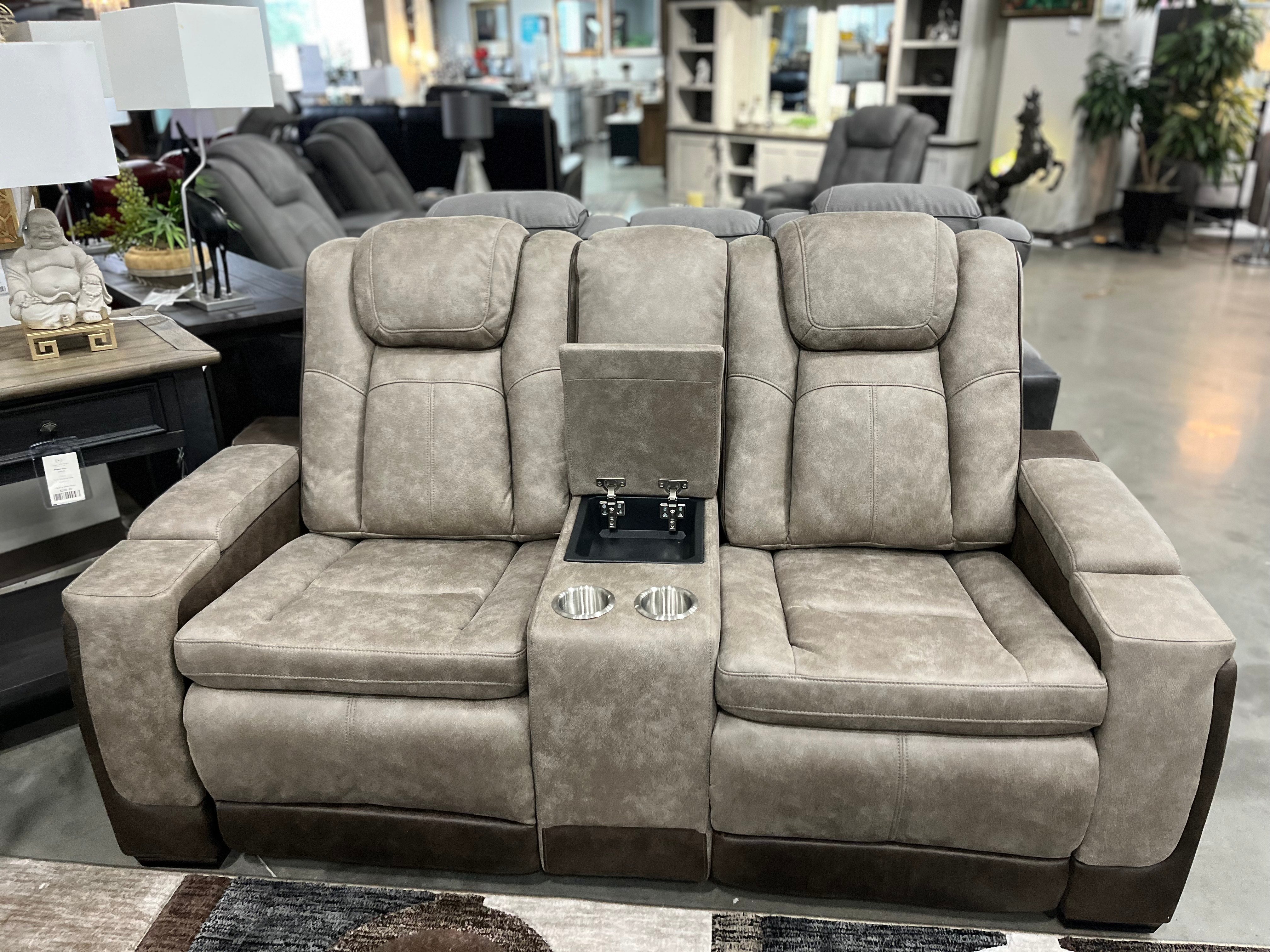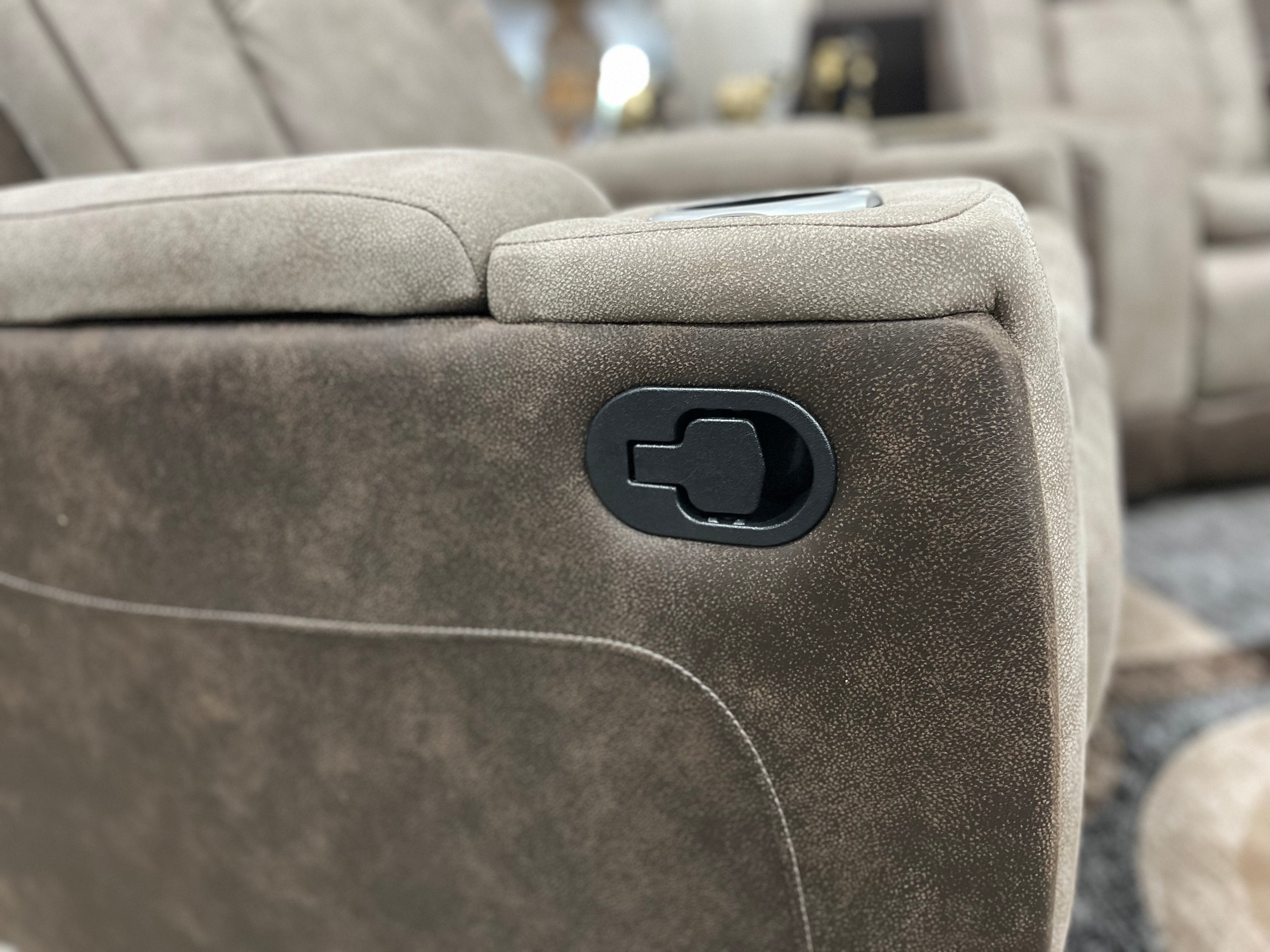 Unwind in luxurious comfort with the Lantana Living Room set, a perfect blend of modern functionality and timeless style. Featuring a manual reclining this set ensures optimal relaxation. The dual-tone and faux leather upholstery adds a stylish touch, while the sofa drop-down table with built-in cup holders keeps your essentials close at hand. Enjoy added convenience with the sofa's reading light, while the loveseat offers a console with cupholders. Complete with hidden storage in the arms the Lantana is designed for effortless living.
