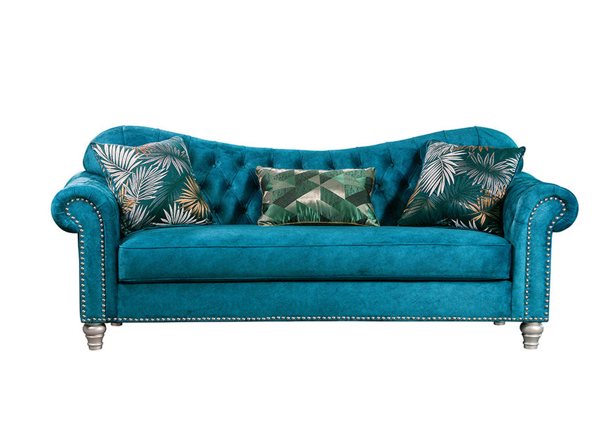 Elegant and eye-catching, the stunning Lucinda sofa and loveseat are the perfect addition to any space. Rich dark teal velvet covers the plush. The comfortable seat was padded with high-density foam and has modern tufted design on the back and sides. Strength and beauty is guaranteed with a wood frame and solid legs. The nail heads that outline the front edge of these beautiful pieces add an extra element of elegance. The Lucinda sofa Set boasts of a terrific finish and stands testimony to the craftsmanship and precision that went into its making. Durable and trendy it is definitely an ideal purchase for your modern lifestyle.