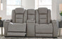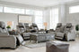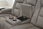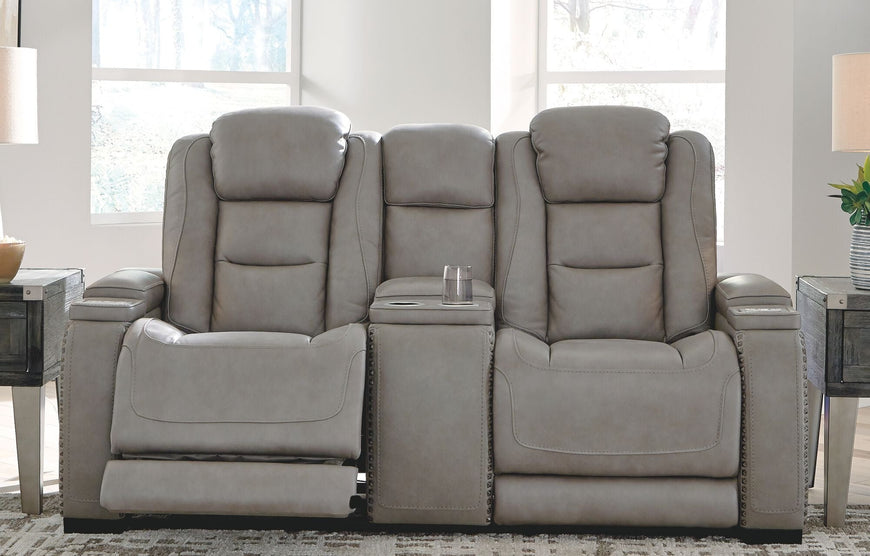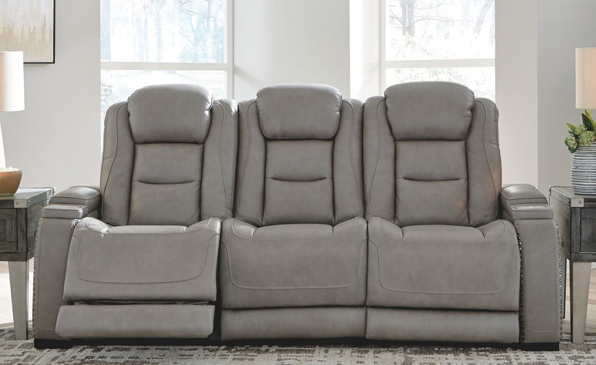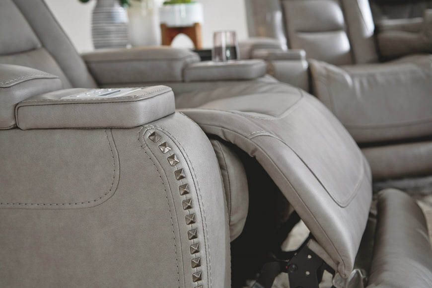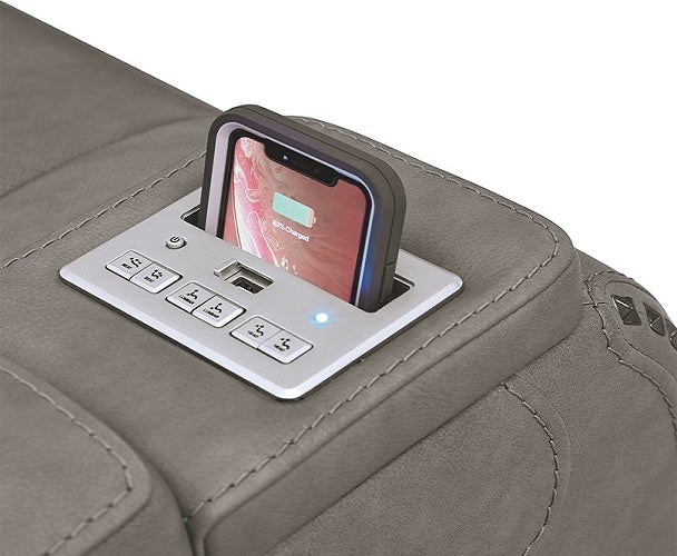 Reserved for him and made for her, The Man-Den Power Reclining Sofa & Loveseat in gray leather delivers all the comfort and style you could ask for in a reclining sofa. Inspired by sports car interiors, the seating area is covered in real leather for your pleasure, with a “perforated automotive” treatment for a luxurious appeal. Positioned at your fingertips, the advanced one-touch power control puts you in the driver’s seat with everything from an Easy View™ power headrest and power lumbar support to a USB port and wireless charging for your phone. The sofa's middle seat reveals a pull-down table with dimmable reading lights and cup holders. Additionally, with integrated cup holders and hidden storage compartments under the posh, padded armrests, this designer power reclining sofa & loveseat makes the most of every inch of space.