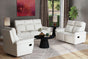 The space features a coordinated set of white leather recliner seating including a three-seater sofa, a two-seater loveseat. Each piece is plushly cushioned, providing both comfort and sophistication. The recliner mechanisms are visible on the sides of each seat, suggesting functionality in addition to style.