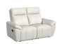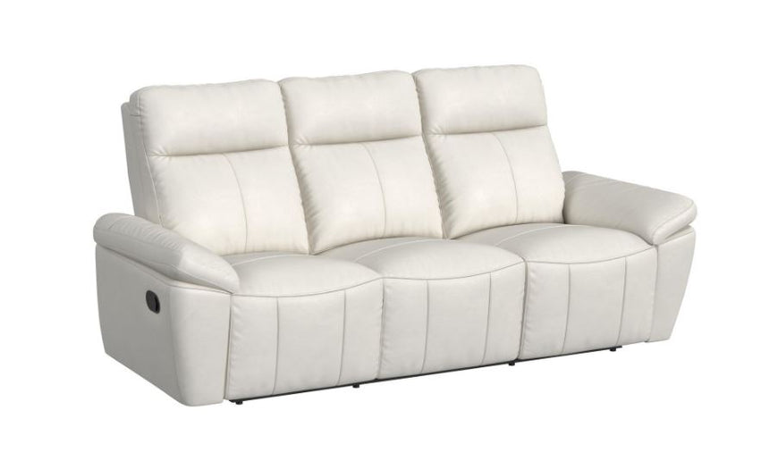 The space features a coordinated set of white leather recliner seating including a three-seater sofa, a two-seater loveseat. Each piece is plushly cushioned, providing both comfort and sophistication. The recliner mechanisms are visible on the sides of each seat, suggesting functionality in addition to style. DImensions:  Sofa- 82L x 34D...