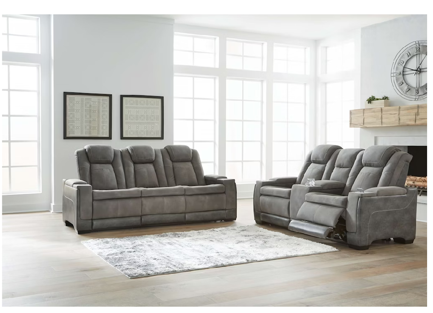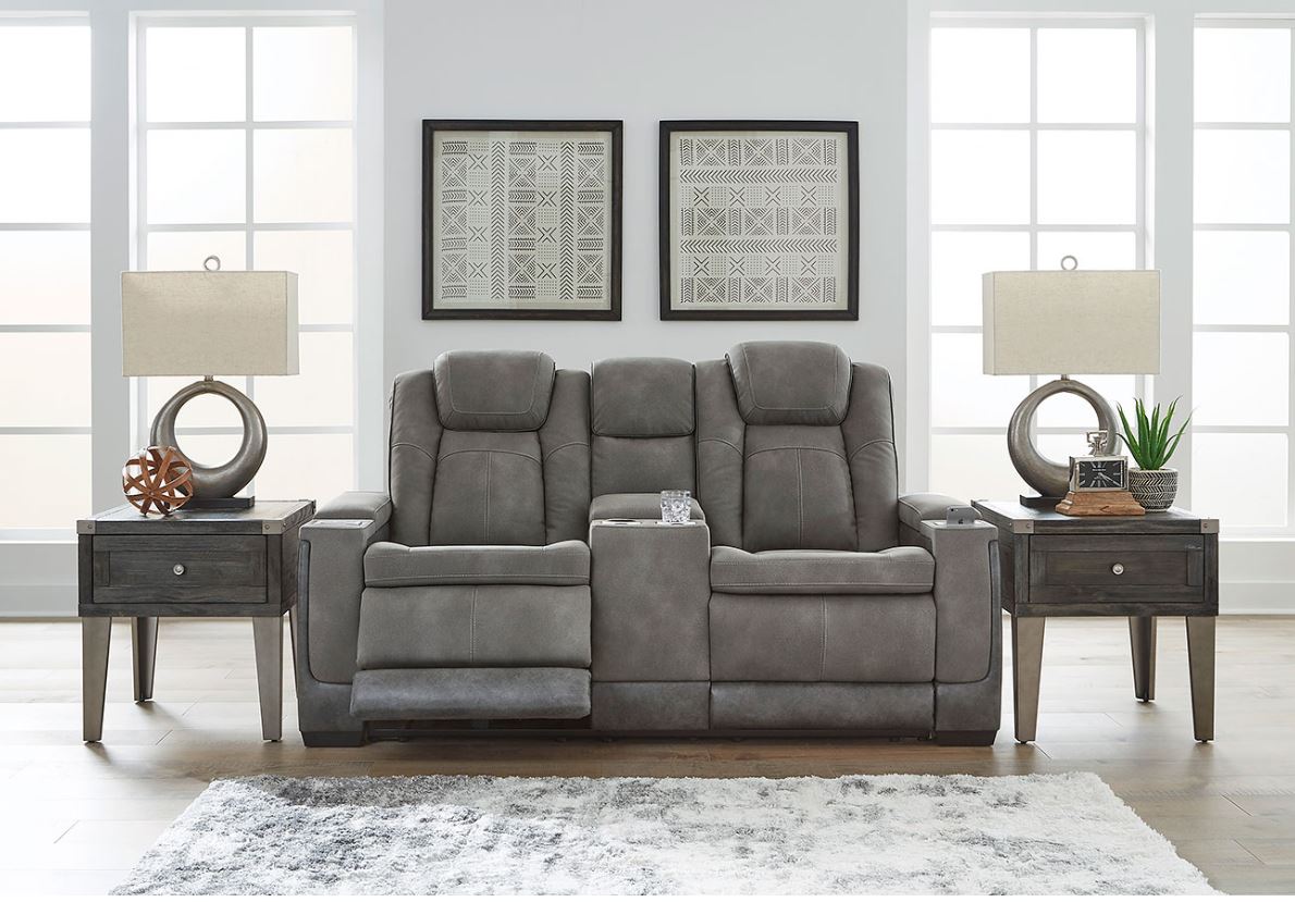 This sleek, ultra-modern Tyson Power Reclining Living Room Set has it all. With designer looks and head-to-toe comfort, the reclining sofa with a drop-down table has the upscale look of leather at a scaled-down faux leather price. Its two-tone Durapella upholstery is more durable and water-repellent than regular leather, an added bonus for families with children or pets. Features including wireless and USB charging, an adjustable headrest, and an extended "zero-gravity" ottoman for improved circulation make this the next generation of power recliners.