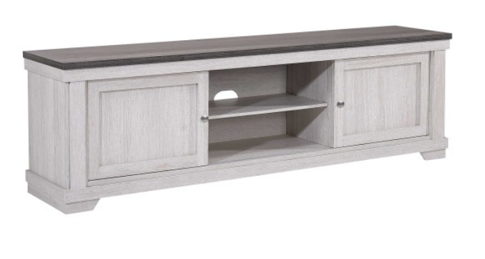 This entertainment console blends rustic charm with modern functionality, perfect for organizing your media setup in style. Its light, weathered wood finish and contrasting dark tabletop provide a striking balance of warmth and elegance. Sliding doors provide both open and hidden storage options for decor and electronics. The built-in cable management system ensures a clean, clutter-free look, while the sturdy design ensures lasting durability. Ideal for a variety of decor styles, this console is a chic and practical addition to any living space.