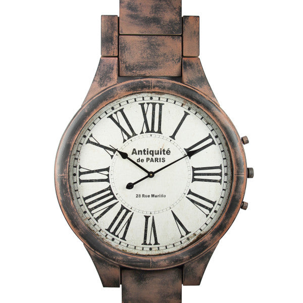 This unique clock will bring a fun, quirky feel to your home or office interior. Appearing to be a giant wristwatch, the frame and top of band is a distressed brown. The face of the clock is white, while the roman numerals are a bold black. The Parisian text in...