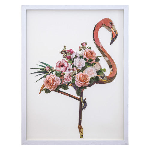 Encased under glass and white frame, this collage was created by using thick layers of patterned paper. The body is formed by a floral arrangement of pink hues, white, and green.