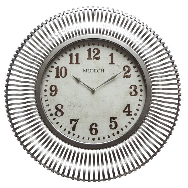 The Munich Wall Clock has a clean and classic distressed white face with distressed black alpha numerals leave the stage for the gorgeous Silver Patina clock frame and matching hands. Since this clock is almost three feet in diameter, it will be perfect for a larger room or wall.