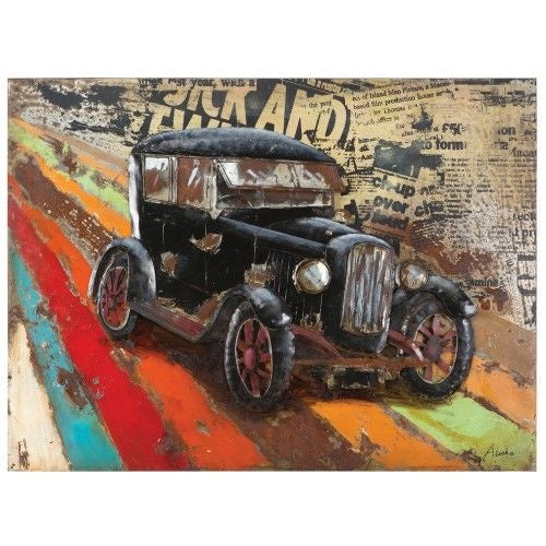 The Off to Neverland is metal artwork piece depicting a vintage black car set against a colorful rainbow background. The top right hand portion of the piece of artwork has different writing for added charm. The rough textures and mixed mediums bring this piece of artwork to life. Place this quirky piece of metal artwork in any room of the home.