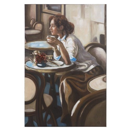 The Out to Lunch piece of artwork is a printed portrait with oil painted embellishment. This portrait depicts a woman quietly sitting in a restaurant at a table enjoying a warm drink. She gracefully leans over the table as if to gaze into the distance. Her loosely fitting clothing adds a certain allure to her. Warm, soft tones are used in the portrait. This portrait has a calming vibe and would look exquisite in any home.