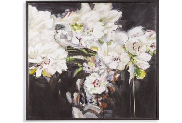 White Peonies features a pop of bright color and incandescent white. This piece displays dramatic contrast and dripping paint, perfect for any space fostering a theatrical feel