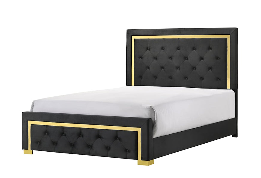 Make a statement with this contemporary glam panel bed as the focal point of your bedroom. Gold-colored accents adorn the headboard and footboard giving a snazzy touch to your space, while button-tufting adds an element of timeless elegance. Black upholstery and a simple silhouette bring this piece into the modern age as the perfect centerpiece for your room.