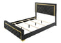Make a statement with this contemporary glam panel bed as the focal point of your bedroom. Gold-colored accents adorn the headboard and footboard giving a snazzy touch to your space, while button-tufting adds an element of timeless elegance. Black upholstery and a simple silhouette bring this piece into the modern age as the perfect centerpiece for your room.