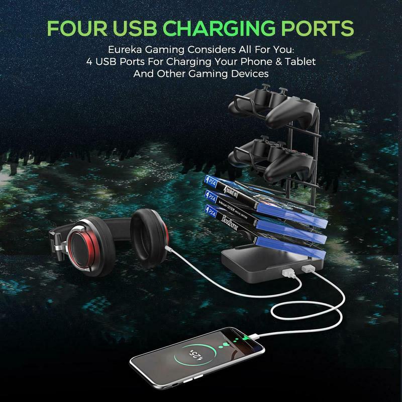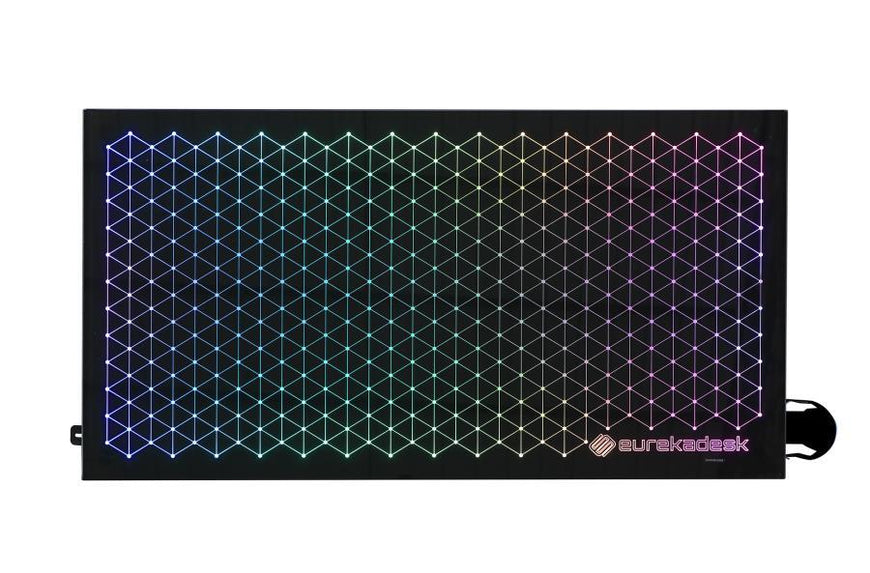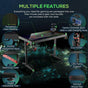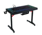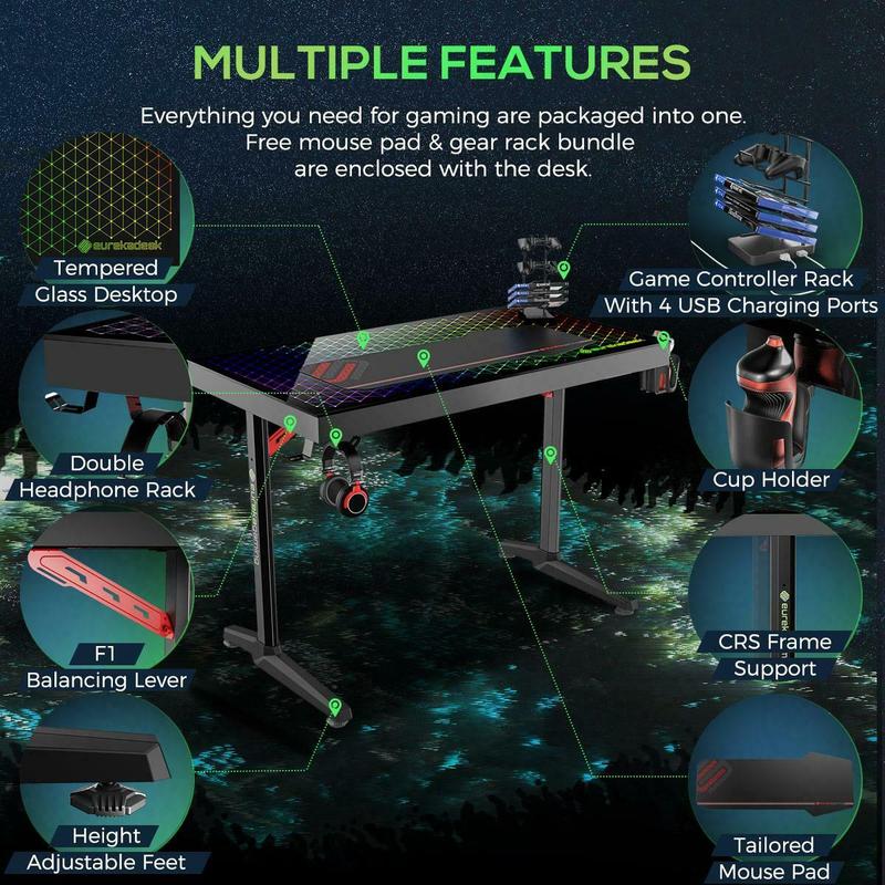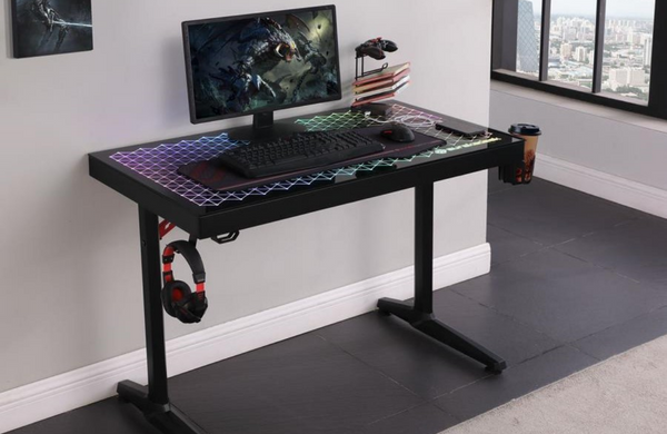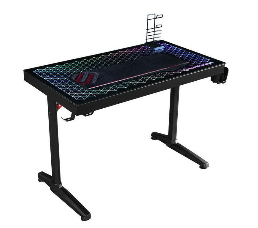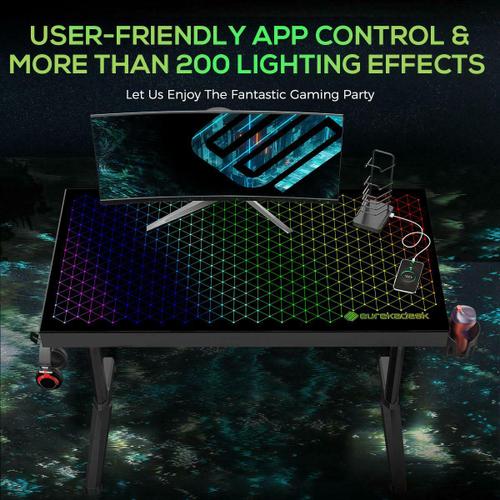 The perfect gaming desk for compact apartments and bedrooms, this contemporary gaming desk has it all! With a tempered glass desktop that features over 200 lighting effects, let it react to your favorite music, easily controlling it through both Android and iOS applications and devices. A convenient built-in dual headset hook and cup holder secures items within reach, so you can game for hours. Plus, a gamer rack invites you to organize controllers and games, while four USB outlets make sure they're good and charged for your next battle. In addition, this gaming desk offers a spacious custom tailored removable mouse pad.