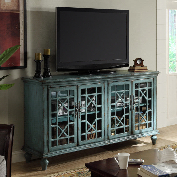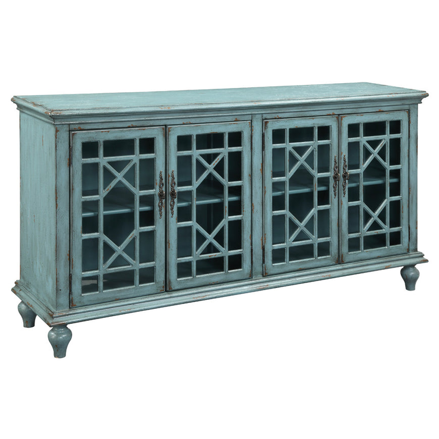 Make a statement with this eye-catching, textured blue media credenza. The beautiful geometric-shaped Chinese Chippendale fret work overlay allows a peek into the four doors. Simple moldings accentuate the horizontal shape and the ornate door pulls add even more detail to the doors.