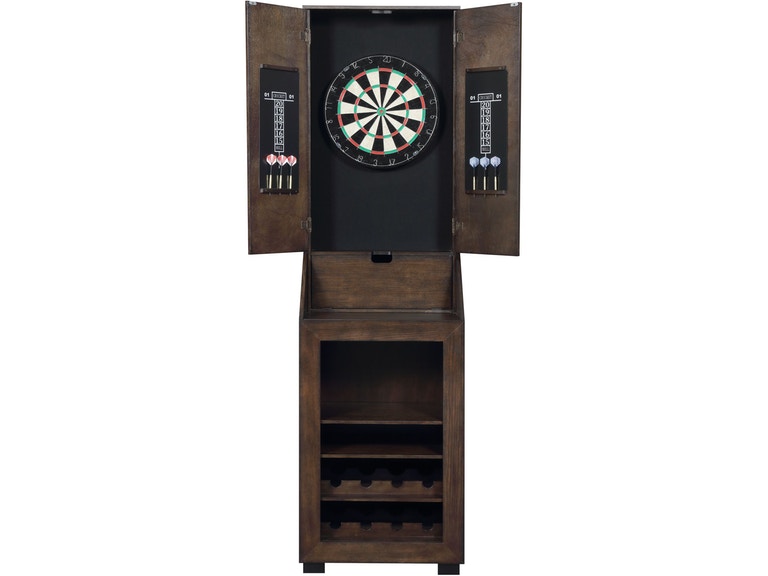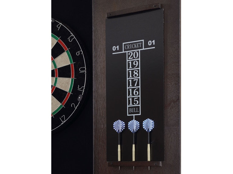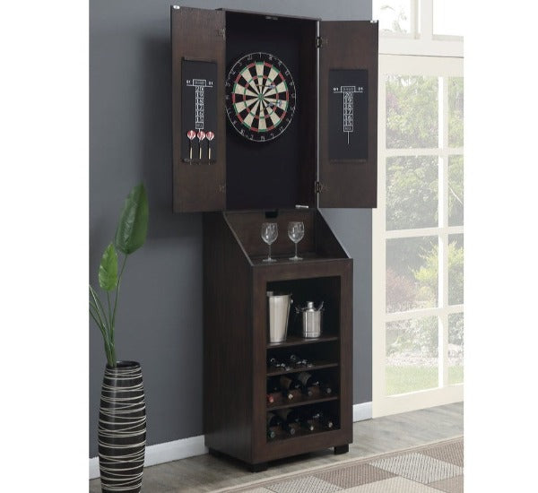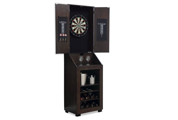 A game room piece, the Bones dartboard cabinet is available in our rich espresso wood finish. It offers elegant looks among your furniture, but is also a multi-faceted tool which offers great functionality. This Cabinet is a multi-functional necessity in every man cave. The cabinet features 6 darts and 2 score keepers. Not only is this piece great entertainment, it is also great for beverage storage, with wine racks and shelving for glasses. Game on.