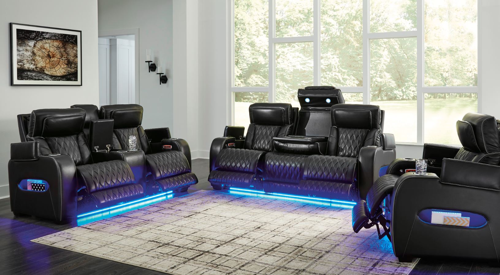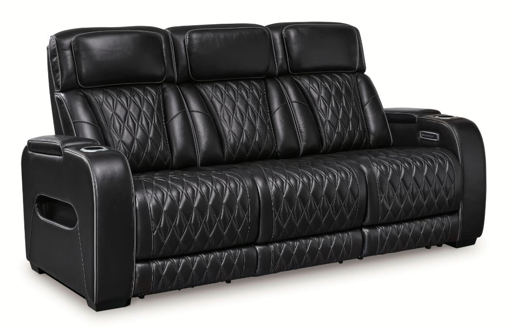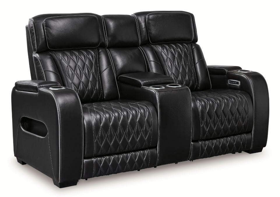 Transform your living space into a hub of comfort and style with the Boyington Power Sofa & Power Console Loveseat in Black. This luxurious set features leather match upholstery and a durable metal frame for long-lasting quality. Both pieces offer dual power reclining mechanisms, allowing you to adjust the headrests and footrests effortlessly at the touch of a button. The loveseat includes a convenient center console with storage and four cupholders, while the sofa also boasts four cupholders and hidden storage.