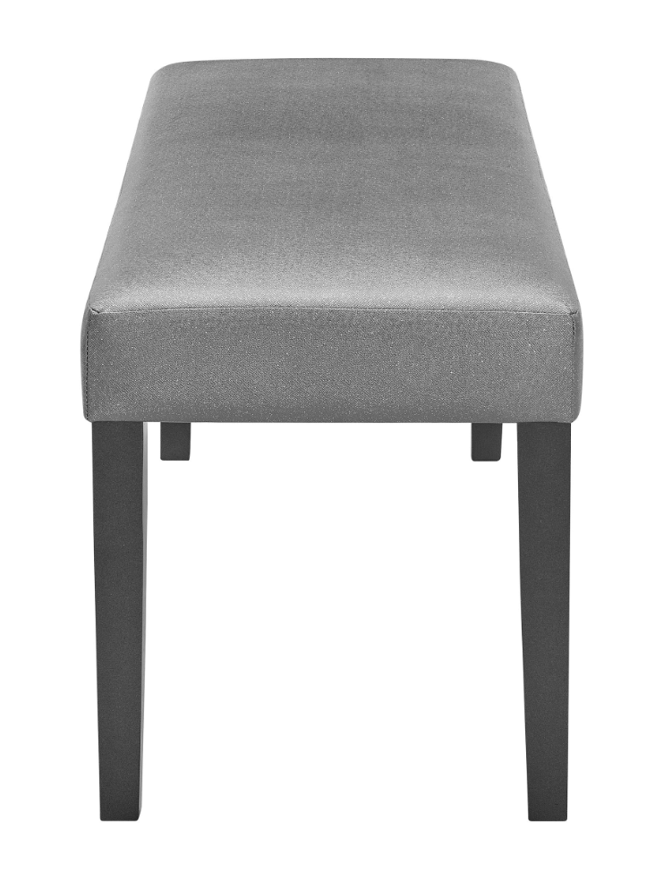 This sleek and modern dining group bridges form and function. The sculptural dining table has a sturdy base and the glass top allows views of the upholstered open shelf. Streamlined chairs and bench feature pewter finished wood and dark gray upholstery with a subtle glitter sheen. Bench: 16" x 46"...