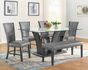 This sleek and modern dining group bridges form and function. The sculptural dining table has a sturdy base and the glass top allows views of the upholstered open shelf. Streamlined chairs and bench feature pewter finished wood and dark gray upholstery with a subtle glitter sheen.