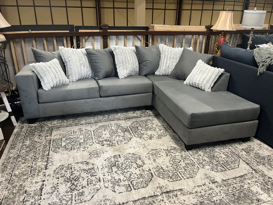 Sleek, contemporary style is epitomized with this sectional. It offers a great look to your living room with loose back cushions with button-tufting, reversible seat cushions, and track arms. Two sets square accent pillows and tapered feet in a dark finish contribute to the stunning style and comfort of this sofa.