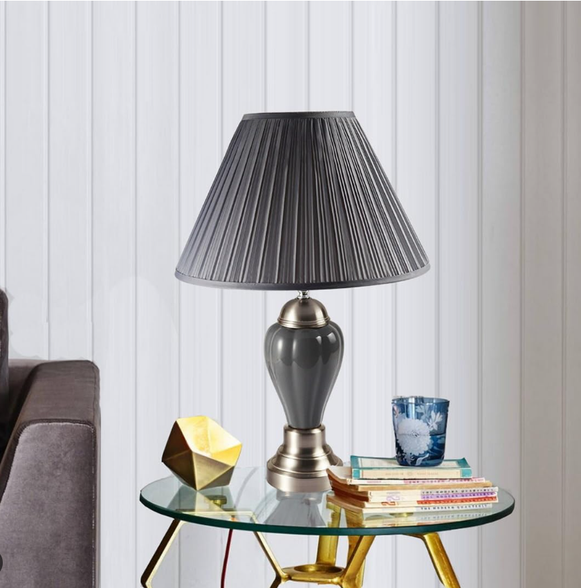 Illuminate your space with this elegantly crafted table lamp. Featuring a glossy ivory base and contrasting metallic details, it's perfect for a modern look. The broad, pleated shade offers a diffused light ideal for any setting.