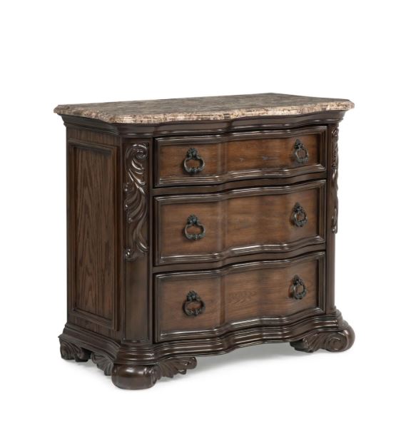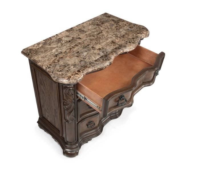 Immerse yourself in timeless elegance with this beautifully crafted Ludwig Nightstand. This nightstand carries a warm brown cherry finish and includes several distinct features, including ornate wood carvings, marble tops, and roped detailing
